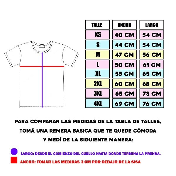 Fácil, lee nuestra tabla de equivalencias que se encuentra en la sección de fotos , luego comparar esas medidas con una Remera básica que tengas y te quede bien. El ancho de la remera se mide a 3cm por debajo de la sisa (Ver gráfico), No de hombro a hombro.